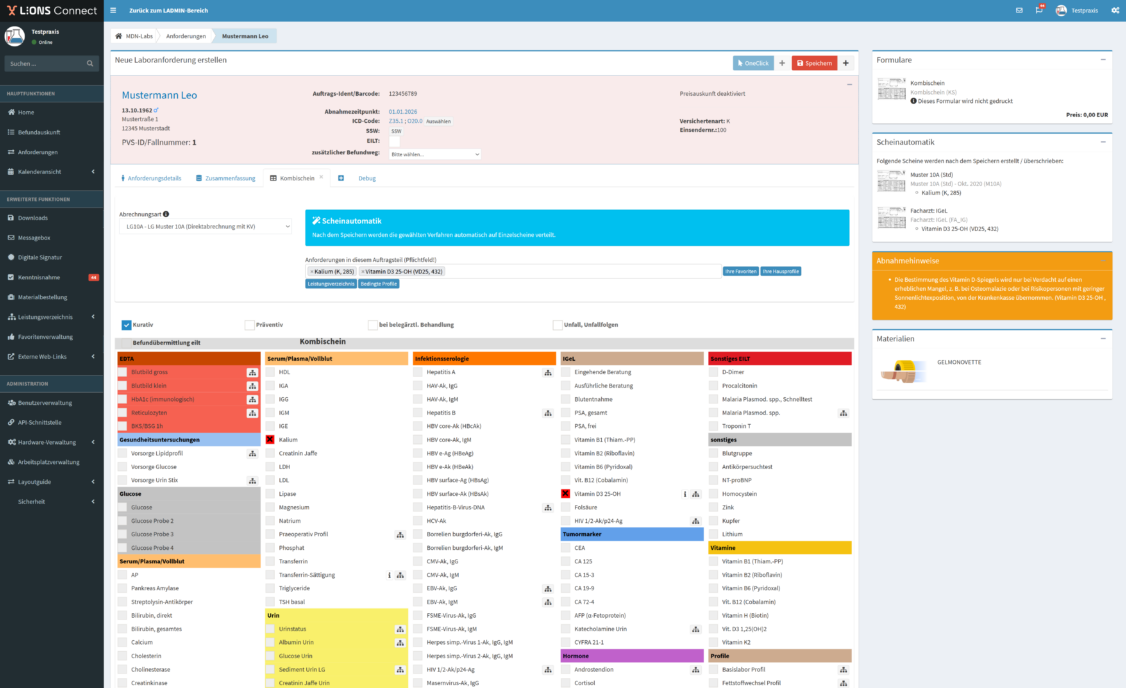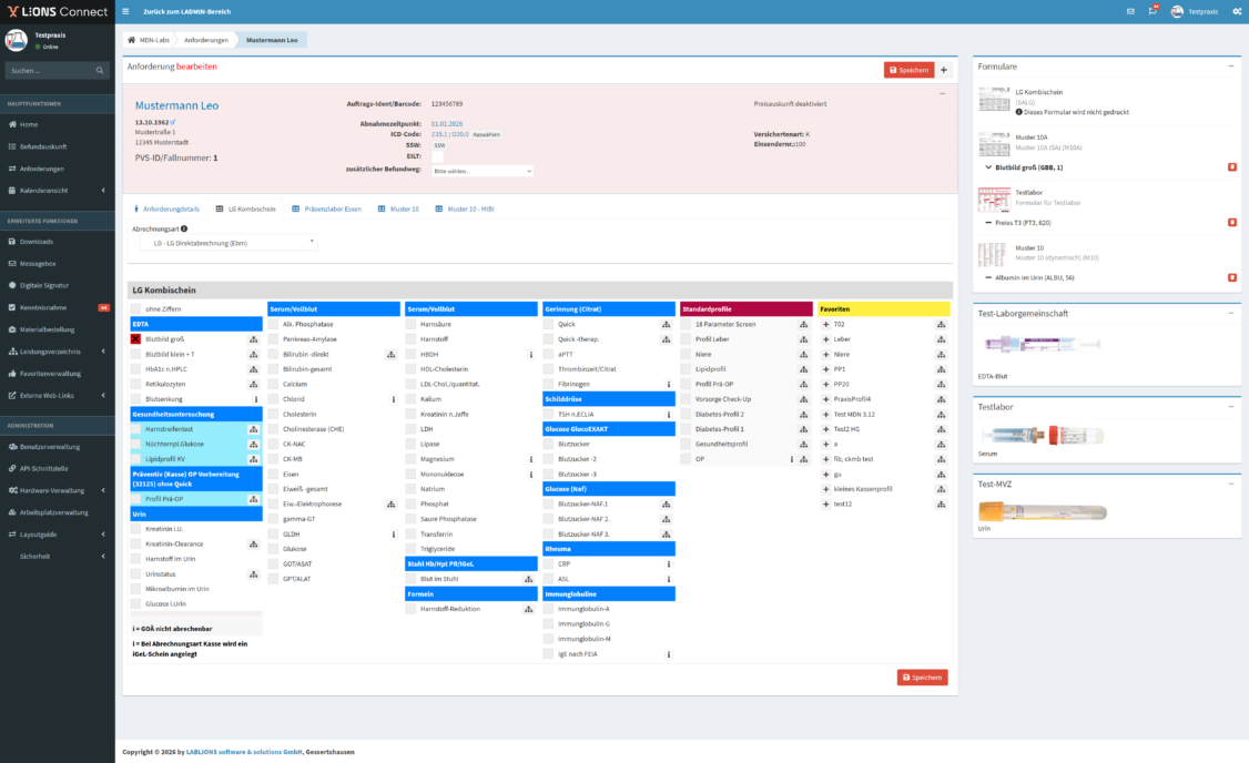 - Nach der Übermittlung des im Order‑Entry‑System erstellten Auftrags werden die beauftragten Untersuchungen automatisch in die Patientenakte sowie in das Laborbuch des AIS übernommen. Dadurch ist im AIS sofort ersichtlich, welche Untersuchungen angefordert wurden.